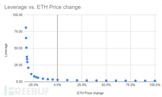 如果 ETH 的价格上涨 20%,你的利润将为 300(1+20%)-300 = 60 美元。你相对于被清算的风险更低,而实际的杠杆水平降低为 360/(360-200)= 2.25 倍。换句话说,你在 ETH 价格上涨时会自动减杠杆。