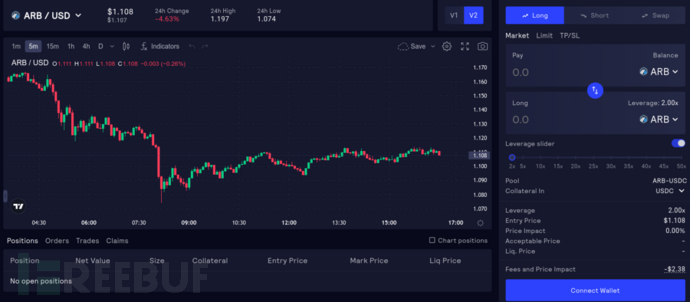 在此过程中,交易者支付交易费、开仓/ 平仓费和借入费,以换取对美元做多/ 做空指定代币(BTC、ETH、AVAX、UNI 和LINK)的上行空间。