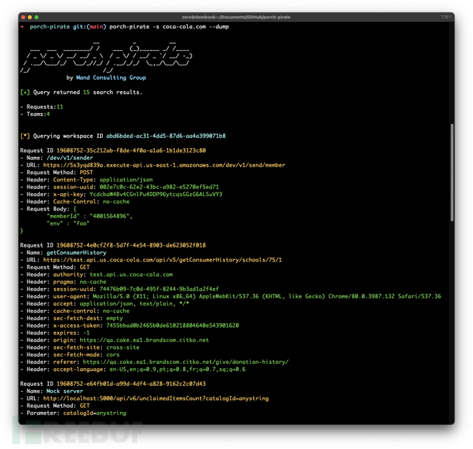 Porch Pirate客户端可以帮助我们以简单快速的形式对公共Postman实体执行全面的安全审计,工具提供了一些预置工作流程和特定关键字来最大限度地提升安全任务执行速度并丰富结果。