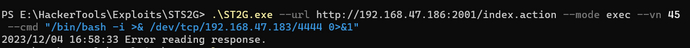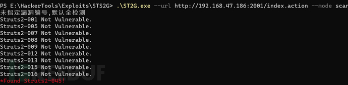 使用 STS2G 扫描器扫描Struts2漏洞,发现 Strus2-045 漏洞(该漏洞存在于Struts2的文件上传功能中,攻击者可以通过修改HTTP头来执行任意代码)