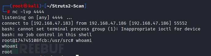 尝试反弹目标系统shell,kali开启ncj监听本机的4444端口,反弹成功,获取到一个非交互性的shell