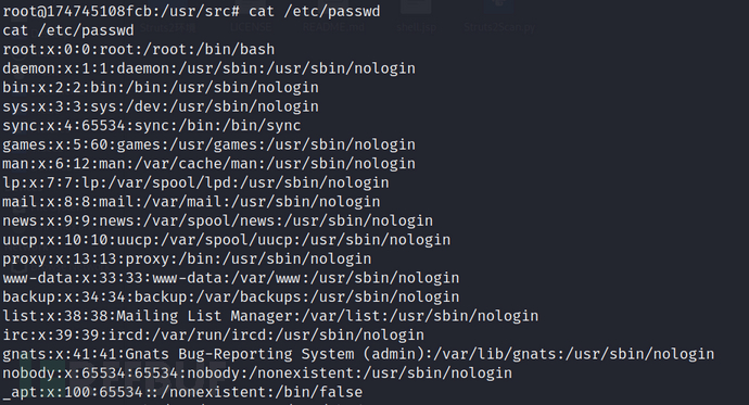 查看 /etc/passwd 和 /etc/shadow 的内容可知,这些账户要么没有密码,要么被禁止登录,当然这是因为反弹到的shell是处于dokcer环境下,后续我们要进行docker逃逸