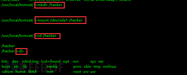 mount /dev/sda1 /hacker #将sda1分区挂载到/hacker目录