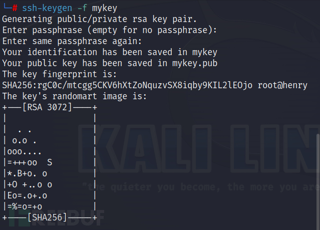 我们可以在kali中使用 ssh-keygen 命令来创建SSH的密钥, -f 参数用于指定生成密钥文件的名称路径,随后系统会提示你输入一个passphrase(密钥短语),这是一个可选步骤,若添加了可以提高密钥的安全性,若私钥落入他人手中,他们还需要知道密钥短语才能使用该私钥