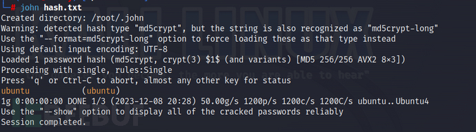 查看目标主机的 /etc/shadow 文件的内容,将其复制到kali中并使用 john 命令进行爆破,成功获取到 ubuntu 用户的密码