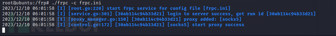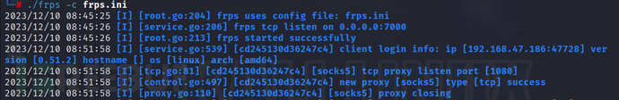 在kali启动frp服务端,frps.ini配置如下所示,启动命令: frps -c frps.ini