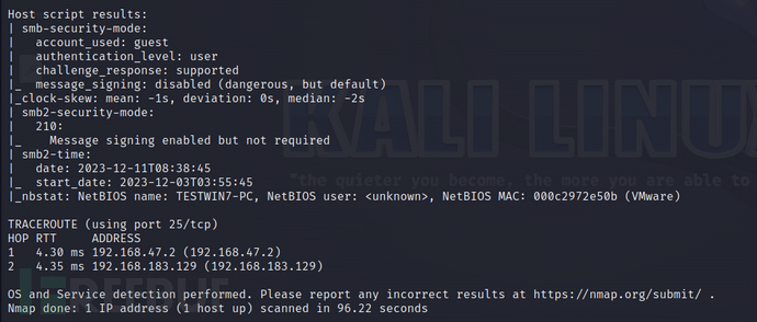 执行结果显示两个IP,分别是 192.168.183.129 和 192.168.183.130,前者的主机名是 TESTWIN7-PC,可推测其系统版本可能是windows7