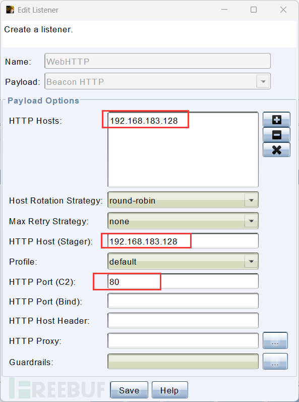 CobaltStrike新建一个HTTP监听,名为WebHTTP,IP地址应填写为Web机的内网IP