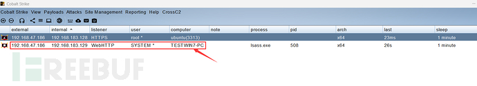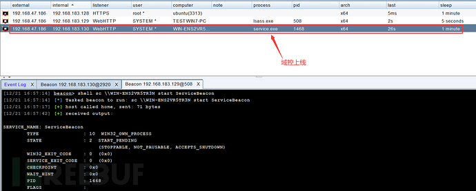 将上述代码生成的木马上传至域控,使用如下命令创建服务并启动,域控成功上线并且没有掉线