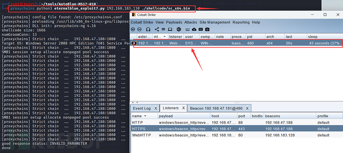 首先下载永恒之蓝的 python exp,将CS生成的二进制文件 payload_x64.bin(最好选择stager类型,经过测试stageless类型或x86位的payload会导致目标主机蓝屏)放入其shellcode目录,随后执行如下命令将 sc_x64_kernel.bin 和 payload_x64.bin 合并成 sc_x64.bin