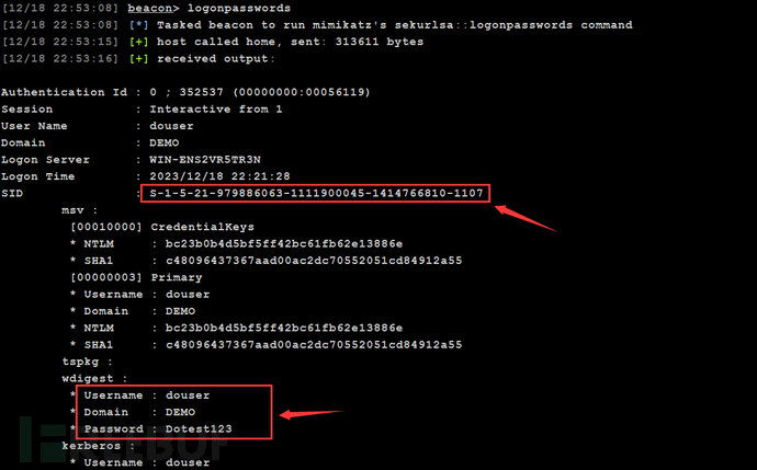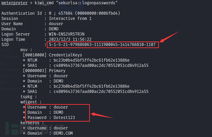 或者使用mimikatz的 sekurlsa::logonpasswords 命令列出用户hash,此处Dotest用户SID为 S-1-5-21-979886063-1111900045-1414766810-1107,这个SID在后续操作中很重要