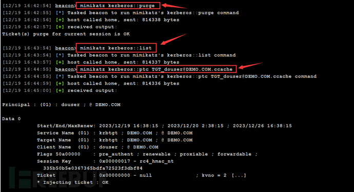 执行如下cmd命令利用ms14068漏洞,执行完毕后会在当前文件夹下生成一个 TGT_douser@DEMO.COM.ccache 文件,这是一个票据文件,能够用于进一步的攻击活动