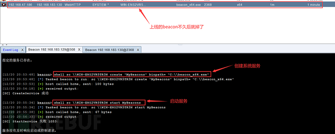 此时我尝试使用SC创建系统服务来执行beacon,虽然beacon成功上线了,但是很快就会掉,随即弹出报错:”服务没有及时响应启动或控制请求“