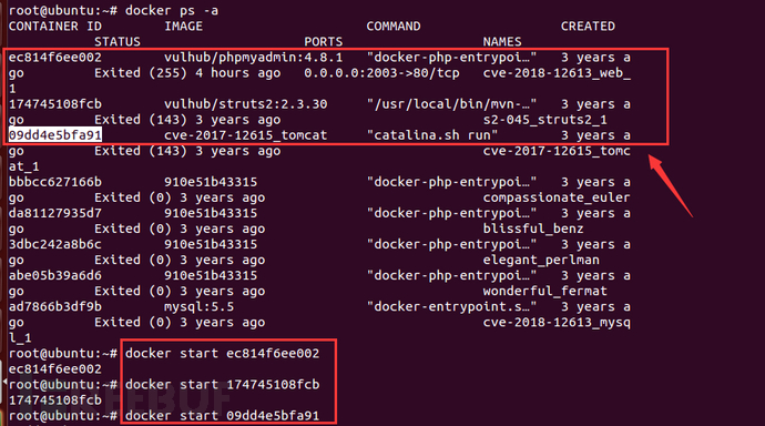使用 docker ps -a 列出当前docker的镜像ID,再使用 docker start [ID] 启动前三个镜像ID