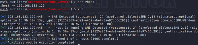 可使用msf模块的 scanner/smb/smb_version 来确定内网主机的系统版本,从扫描结果可以看出, 目标主机运行的是 Windows 7 Enterprise Service Pack 1 7601