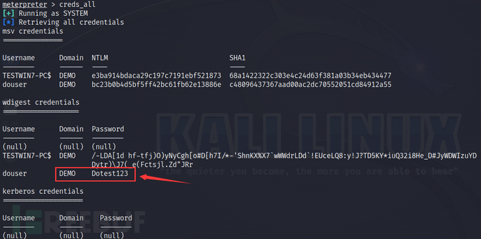 加载mimikatz并获取目标主机的内存凭据,获取到PC机的凭据: douser:Dotest123