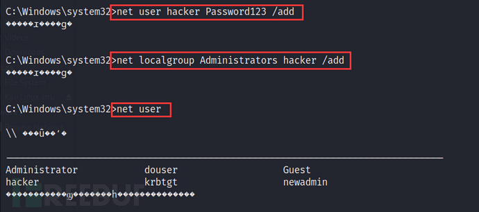 在域控创建一个拥有管理员权限的用户 hacker,其密码是 Password123