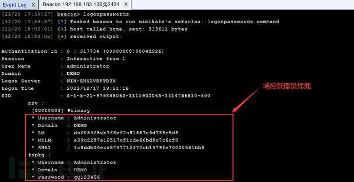 在PC机的beacon命令行执行mimikatz,成功获取到用户的凭据和SID