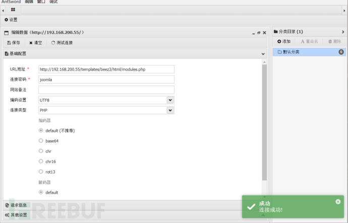 Joomla后台可编辑模板,利用这个功能,在template下面创建一个 test.php,写入一句话,蚁剑成功连接
