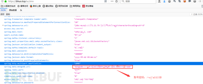 ②数据库账户密码泄露;由于 actuator 会监控站点 mysql、mangodb 之类的数据库服务,所以通过监控信息有时可以拿下 mysql、mangodb 数据库;这个主要通过/env 路径获取这些服务的配置信息,比如如下站点存在 actuator 配置不当漏洞,通过其/env 路径,可获得 mysql、mangodb 的用户名及密码: