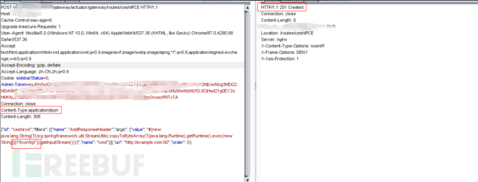 接下来构建POST请求包,在/gateway/actuator/gateway/routes/ceshiRCE 添加一个包含恶意的SpEL表达式的路由,这里我创建ceshiRCE路由,命令用的是ifconfig,这里可以也用其它的命令,注意的是Content-Type:application/json要修改为json,发包后返回201说明添加成功