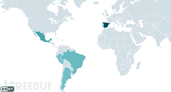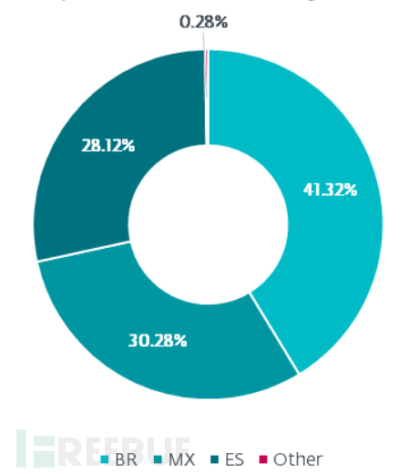 这只是攻击者预期的国家分布,比如阿根廷的受害者完全没有反映。巴西、墨西哥和西班牙几乎包揽了全部,也有极少部分受害者被标记为 PM(圣皮埃尔和密克隆群岛)、GR(希腊)或 FR(法国)。分析人员认为这些要么是错别字,要么另有含义,而非针对这些国家。