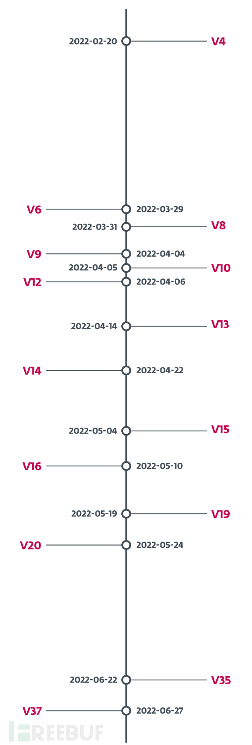 Grandoreiro 僵尸网络一直在持续更新,最频繁时每周都有几个新版本发布。2022 年 2 月,Grandoreiro 在恶意样本中增加了版本标识符。统计可以发现,2022 年 2 月到 6 月平均每四天就发布一个新版本。六月底发布了 V37 版本后,版本号就再也没有发生过变化,这一功能应该是被放弃了。