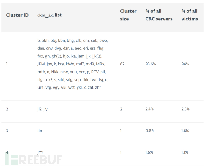 极少数情况下,也有相同的 IP 地址在几天后被其他 dga_id 重用。研究人员最初认为每个 dga_id 是唯一的,但这是不正确的,样本间存在配置共享相同的 dga_id。以下为共享至少一个 IP 地址的所有 DGA 配置都聚合在同一集合中,受害者占比过低的集合将会被忽略。