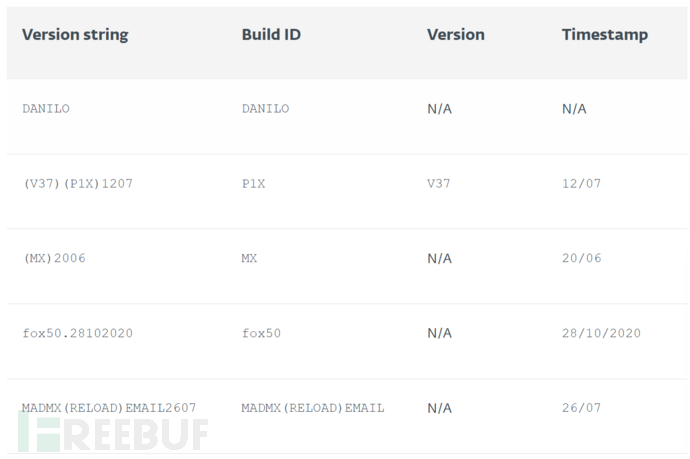Country 是硬编码的字符串,不是通过执行命令获取的,更可能是攻击者预期的受害者所在国家。Bank codename 是银行或者其他金融机构的关键字符串,受害者访问网站就会触发 C&C 回连。Version 也是硬编码的,标识特定的构建系列、版本与时间戳。请注意,某些时间戳仅包含月份和日期,也有部分时间戳包含年份。