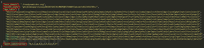 DGA 使用在二进制文件中硬编码的特定配置,存储在多个字符串中。将 JSON 格式化后如下所示: