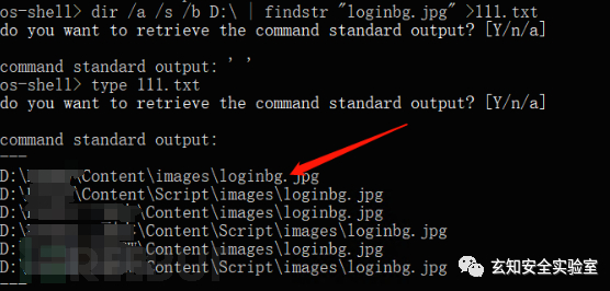 dir /a /s /b D:\ | findstr "loginbg.jpg" >111.txt //在D盘中查找loginbg.jpg