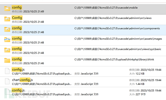 接下来可以再找一找其中的配置文件,我们可以去搜config等类型的文件名称,这些文件中会包含一些项目关键配置