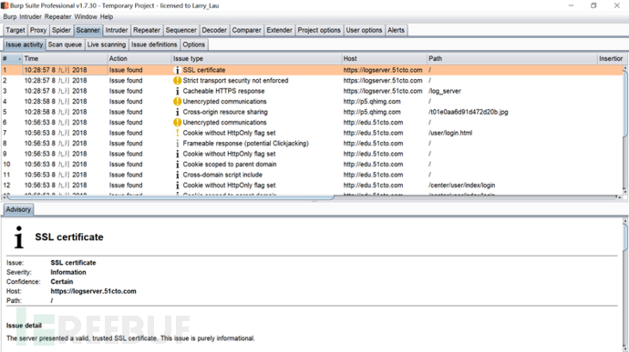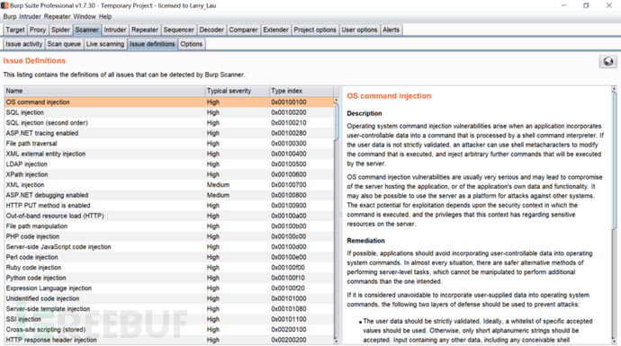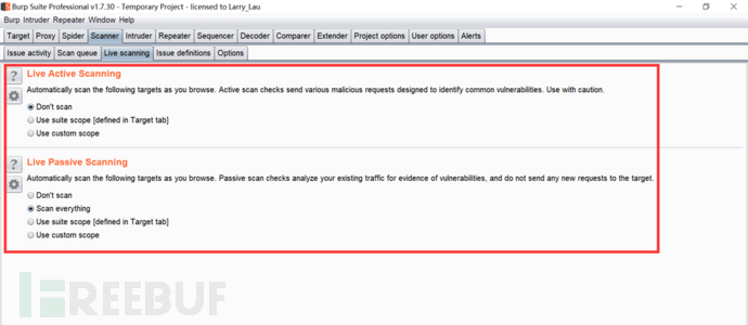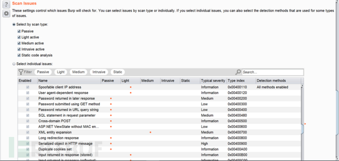 Burp Scanner的功能主要是用来自动检测web系统的各种漏洞,我们可以使用Burp Scanner代替我们手工去对系统进行普通漏洞类型的渗透测试,从而能使得我们把更多的精力放在那些必须要人工去验证的漏洞上。