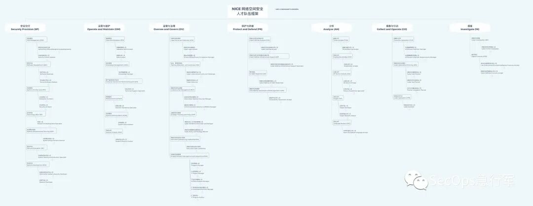 《NICE 网络安全人才队伍框架》中核心内容如上图,其中涉及 7 大类别的 32 个专业领域,38 种工作角色的 1007 类任务所需的 1180 种知识、技能和能力(KSA)。有兴趣的读者可以阅读文献[4]了解详情。