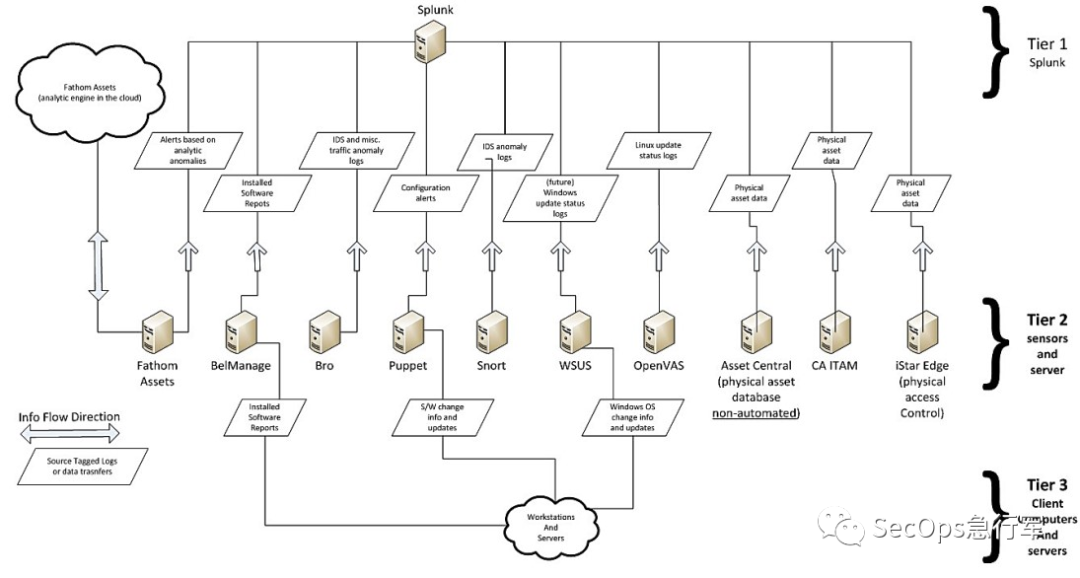 简单说就是一个政企合作的组织,带有一定的商业性质(各有利弊吧),直接在所谓“最佳实践”中给出具体厂商、产品。来张图感受下,这是SP1800-5 IT资产管理的数据信息采集流程图,出现了诸如Splunk、Bro、WSUS等商业产品,也有诸如Snort、OpenVAS等开源产品。