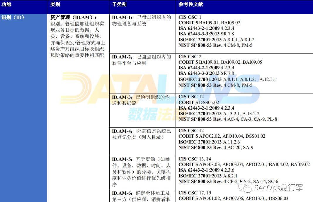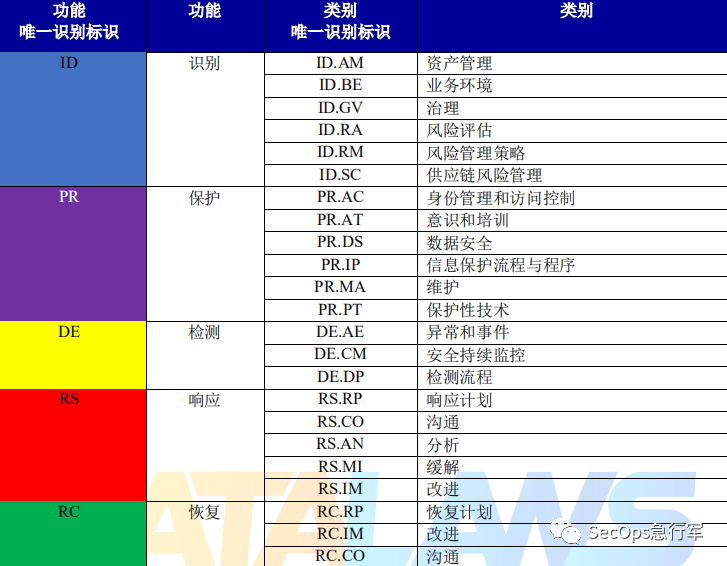 将五大功能(识别、防护、检测、响应、恢复)细分出多个类别,都给出ID,方便后面进行索引,如下图所示: