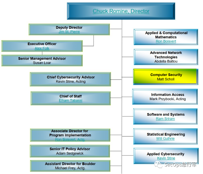 ITL 的组织架构如图所示(2020/5/15 更新),可以看到 计算机安全 是一级部门,由 Matt Scholl 负责。