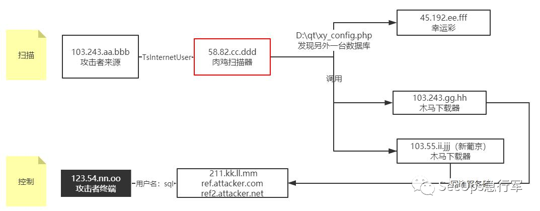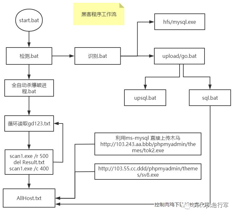 横向,是后门植入工作流,具体不展开。最后利用 sql.bat 将 tok2.exe 和 sv8.exe 植入肉鸡中。