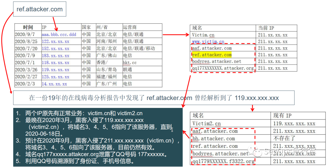 巧合的是,在搜索引擎中找到一份19年的在线病毒分析报告,从中发现了 ref.attacker.com 曾经解析到了 119.xxx.xxx.xxx,查找 119 这个IP的历史解析域名,有了新的收获。