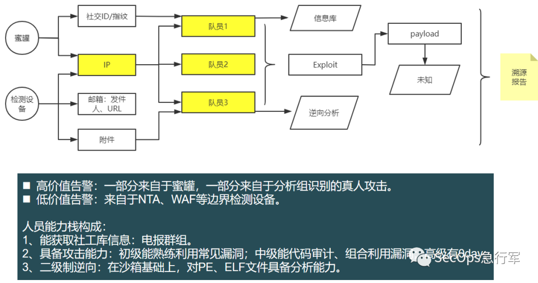 **再者是建立完备的协作机制。**对外:1)和公安部门保持顺畅的沟通渠道,由价值线索尽快联动;2)依托厂家的情报信息,包括威胁情报、蜜罐情报等。对内:和分析组、夜班做好衔接,确保所有攻击线索都完成反打。利用共享文档进行信息记录。