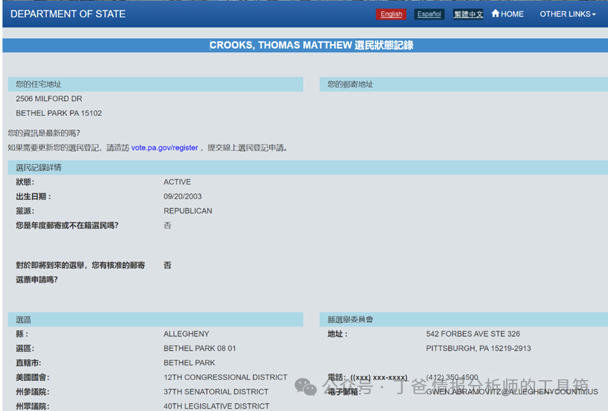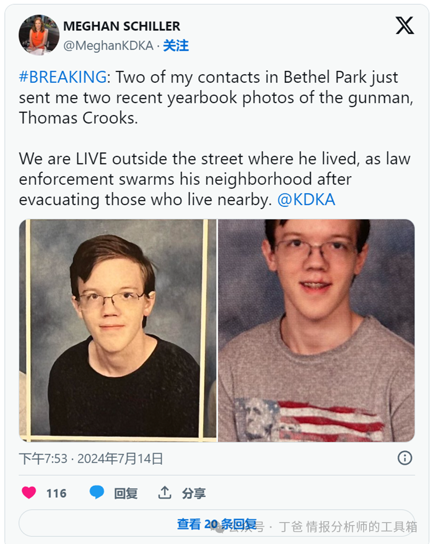 枪击事件发生后,网上各种信息蜂拥而至,真假难辨,比如刚开始就有谣言说枪手是中国人。后来新闻报道了枪手是宾夕法尼亚当地20岁的年轻人:托马斯·马修·克鲁克斯(Thomas Matthew Crooks),后来又有谣言说枪手有暴力倾向,有很多前科,多次被逮捕。