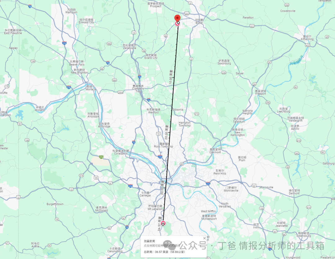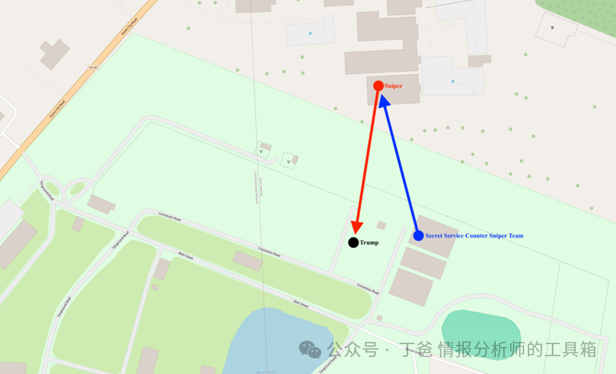 上图黑色点为特朗普被枪击时所在的位置,红点为枪手托马斯·马修·克鲁克斯的位置,蓝色点为美国特勤局狙击手所在的位置。新闻说枪手托马斯·马修·克鲁克斯开枪后特勤局狙击手迅速发现他并将其击毙。