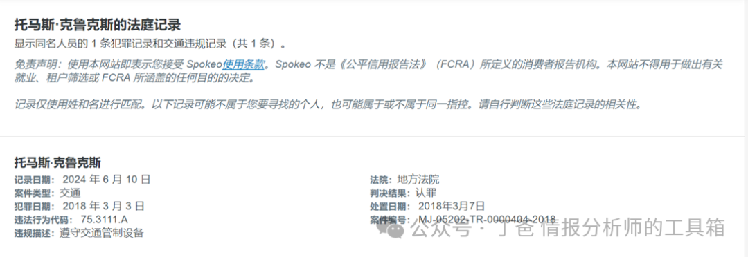 网传其有多次违法犯罪记录,但在美国法庭记录中,仅查到同名字人员有一条2018年的交通违法记录,而枪手是2003年9月20日出生的,2018年才15岁,应该还不能驾驶车辆。