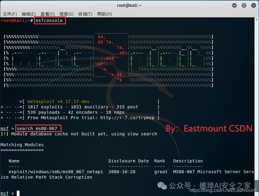上一篇文章将详细介绍Windows远程桌面服务漏洞(CVE-2019-0708),该高危漏洞利用方式是通过远程桌面端口3389,RDP协议进行攻击。这篇文章将详细讲解MS08-067远程代码执行漏洞(CVE-2008-4250)及防御过程,它是Windows Server服务RPC请求缓冲区溢出漏洞,利用445端口,并通过Metasploit工具获取shell及进行深入的操作。希望对入门的同学有帮助。